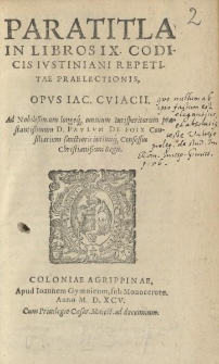 Dzieło prawnicze autorstwa francuskiego prawnika Jacques’a Cujasa (1522-1590) będące próbą rekonstrukcji ustaw cesarza Justyniana I Wielkiego w oparciu o zachowane fragmenty kodeksów - jednej z trzech części wielkiej kompilacji prawa rzymskiego. Dzieło otwiera dedykacja adresowana do francuskiego dyplomaty Paula de Foix, który podzielał zainteresowania Cujasa prawem rzymskim i filologicznymi badaniami nad źródłami historycznymi. Po nim autor zamieścił alfabetyczny spis omawianych ustaw z zakresu ius civilis. Cujas w swoim opracowaniu skupia się na szerszym omówieniu kontekstu historycznego zawartych w kodeksach praw, mniej uwagi przywiązując do ich praktycznego zastosowania (ujęcie historyczne). Odzwierciedleniem tego jest także struktura dzieła - uporządkowanie materiału z zachowaniem kolejności z kodeksów Justyniana i ich opracowanie z przywołaniem licznych źródeł literackich wspierających filologiczną rekonstrukcję materiału źródłowego. Na treści opracowanych kodeksów składają się przepisy prawa kościelnego i ustrojowego (ks. I), cywilnego (ks. II-VIII) i karnego (ks. IX). Dokument współoprawny z innymi drukami (klocek introligatorski), sygn. SD.XVI.1106 - SD.XVI.1107.