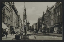 Tytuł według nadruku na awersie. Nazwa wydawcy według nadruku na rewersie. Pocztówka z obiegu, z datą stempla 8 września 1932 roku. Na rewersie tekst rękopiśmienny w języku niemieckim. Karta pocztowa przedstawia fragment ulicy Stary Rynek i widoczną na pierwszym planie studnię ozdobioną neogotycką kompozycją. Ulicę Stary Rynek wytyczono już w 1237 roku i jest to jedna z najstarszych ulic w mieście. Badania archeologiczne potwierdzają jej istnienie przed wielkim pożarem z roku 1288. Najdłuższą i najszerszą wówczas ulicę w mieście od północy zamyka Brama Targowa, od południa zaś pierzeja ul. Wigilijnej. Od początku istnienia miasta była centralną arterią komunikacyjno-handlową. W średniowieczu była podzielona na odcinki, przy których prowadzono handel określonymi towarami: Targ Chlebowy (między ulicami św. Ducha i Mostową), Targ Sienny (między Rybacką i Bednarską), Targ Węglowy (między Bednarską i Studzienną), Targ Koński (między Kowalską i Wieżową). Przy Starym Rynku, w okolicy kościoła farnego pod wezwaniem św. Mikołaja, ulokowano najważniejsze obiekty życia publicznego: ratusz, sukiennice, budynek wagi oraz budy kramarskie. Widoczna na pierwszym planie studnia była główną studnią zaopatrującą elblążan w wodę pitną, nazywana dawniej śpiewającą studnią. Jej powstanie wiąże się z budową Kanału Młyńskiego przez Krzyżaków, co przypadało na lata 1280-1320. Właśnie wtedy studnia zyskała swoją nazwę Pfeifen Brunnen, która dosłownie oznacza gwiżdżące źródło, być może dlatego, że koniec rury, z której płynęła woda przypominał gwizdek, a być może z tego powodu, że wydawała dźwięki. W 1694 roku elbląski rzeźbiarz Andreas Silber podjął się jej przebudowy i zamontował posąg Herkulesa. Według zapisów, postać rzymskiego herosa nawiązywała do króla Jana III Sobieskiego, który szczególnie zasłużył się w 1683 roku, kiedy to dowodził w bitwie pod Wiedniem. W 1885 roku, Herkules został zmieniony na posąg Neptuna, opiekuna mórz i oceanów, patrona marynarzy. Od tamtego czasu, studnia funkcjonowała jako fontanna i była miejscem licznych spotkań mieszkańców. W 1895 r. zbyt blisko fontanny poprowadzono linię tramwajową i co jakiś czas dochodziło do wypadków, toteż w 1939 postanowiono fontannę przenieść na skrzyżowanie Starego Rynku z ulicą Mostową. „Przeprowadzka” fontanny odbyła się w marcu 1939, a przed umiejscowieniem Pfeiffenbrunnen w nowym miejscu zabytek poddano renowacji. Niestety, ze względu na zniszczenia spowodowane działaniami wojennymi, ślad po śpiewającej studni zaginął. Lokalizacja oryginału - w zbiorach prywatnych Artura Jaroszewskiego. Opis fizyczny: 1.K; wymiary: 13,8 x 8,7 cm.