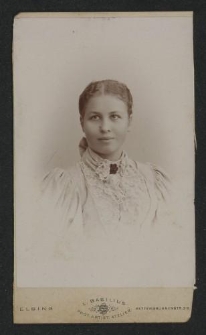 Fotografia studyjna pochodząca z elbląskiego atelier Lorenza Basiliusa (1860-1918). Na awersie portret młodej kobiety oraz nadruk z danymi fotografa (L. Basilius Phot. Artist. Atelier, Elbing, Kettenbrunnenstrasse 2-3). Na rewersie karta wizytowa atelier Basilisua. Datowanie fotografii: 1898-1918. Lorenz Basilius (1860-1918) to jeden z najwybitniejszych fotografików dawnego Elbląga. Wraz z żoną Johanną (1865-1965) prowadził największe atelier fotograficzne w Elblągu na przełomie XIX i XX wieku. Fotograf urodził się w 16 czerwca 1860 roku we Flensburgu. Chciał zostać inżynierem, ale z braku możliwości finansowych zdobył wykształcenie jako fotograf i z dużym powodzeniem uprawiał ten zawód. W 1888 roku w Berlinie poślubił retuszerkę Joannę z d. Schierloh. Po ślubie rodzina przeniosła się do Bydgoszczy, gdzie urodziła się im najstarsza córka Erna. W 1898 roku przenieśli się do Elbląga i kupili dom na Kettenbrunnenstrasse. 2/3 (dzisiejsza ul. Studzienna) i tam zamieszkali. Na poddaszu otworzyli atelier fotograficzne z przeszkloną altaną. W tylnych pomieszczeniach znajdowały się pracownie do wywoływania zdjęć i ich obróbki. Z wąskiego korytarza wchodziło się do właściwego pokoju urządzonego jak salon. Tam znajdowały się różnego rodzaju rekwizyty i klient mógł sobie wybrać któreś z nich, podobnie jak blejtram, na którego tle chciał być sfotografowany. Basilius specjalizował się w wykonywaniu powiększeń, zdjęć portretowych, grupowych i fotografii dzieci. Elbląskie atelier Basiliusa czynne było codziennie od 9.00 do 19.00. Od około 1898 roku zaczął wydawać widokówki Od 1900 roku sprzedawał także wszelkiego rodzaju artykuły fotograficzne. Od 1904 roku wykonywał powiększenia z każdego zdjęcia. W 1907 roku w książce "Die Stadt Elbing und ihre Umgebung" Karla Pudora zamieszczono 67 jego zdjęć z Elbląga i okolic. W 1912 roku zachwalał wykonywane w swoim salonie zdjęcia portretowe, obrazy, ujęcia architektoniczne i zdjęcia wykonane w domach swoich klientów. Przez wszystkie lata reklamował się regularnie w miejscowych gazetach, co najmniej 2 razy w miesiącu. Brał aktywny udział w życiu sportowym miasta. Od 1903 roku był członkiem Elbląskiego Towarzystwa Gimnastycznego. W 1918 roku w wieku 58 lat, krótko po śmierci swojego syna Hansa zmarł. Po śmierci męża Joanna Basilius sprzedała posiadłość i atelier fotograficzne i przeniosła się do córki Erny Horn, do Sopotu. W 1925 roku przeprowadziła się na wieś Born i tam zmarła w 1965 roku. Lokalizacja oryginału - w zbiorach prywatnych Artura Jaroszewskiego. Opis fizyczny: 1.K; wymiary: 6,0 x 10,4 cm.