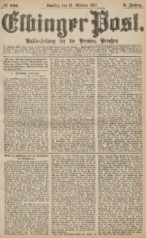 „Elbinger Post”. Gazeta ludowa dla prowincji Prusy. Ukazywała się codziennie z wyjątkiem poniedziałków i dni poświątecznych. Okoliczni czytelnicy mieli możliwość zamówienia prenumeraty. Dziennik czterostronicowy, gdzie na pierwszej stronie zamieszczano przegląd polityczny i wiadomości z kraju i ze świata. Wydawca starał się umieszczać artykuł wstępny, poniżej artykuły dotyczące np. wystaw światowych, historii cygar, introligatorstwa, poglądów na małżeństwo, wrażeń z podróży zagranicznych (artykuły dostarczane od korespondentów oraz osób prywatnych), zamieszczane były również wiersze . Na drugiej stronie informacje z Niemiec, wiadomości o obradach parlamentarnych oraz teść telegramów wysyłanych do redakcji o najświeższych wydarzeniach. Strona trzecia poświęcona była zagadnieniom z prowincji (Gdańsk, Toruń, Grudziądz, Pasłęk, Tczew). Ostatnią stronę zajmowały ogłoszenia i reklamy, spora część adresowana była do rolników i hodowców, znajdowały się ogłoszenia z zapowiedziami kulturalnymi (spektakle teatralne, występy gościnne), ogłoszenia drobne i anonse (inseraty). Do niektórych numerów ukazywały się dodatki (Beilage). Dziennik ukazywał się w układzie trzykolumnowym, wydawany w elbląskiej drukarni Neumann-Hartmann przez właścicieli m.in. Edwarda Schlömpa czy później Theodora Mohr’a (od nr 85 roku 1875). Dziennik posiada pieczątki własnościowe Heinricha Wiedwalda.
